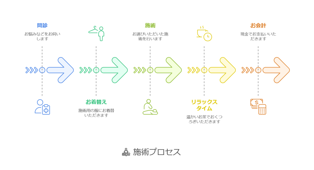 施術が終了しましたら、身支度を整えていただきます。その後は、温かいお茶をご用意しておりますので、少しゆっくりしてからお帰りいただけます。